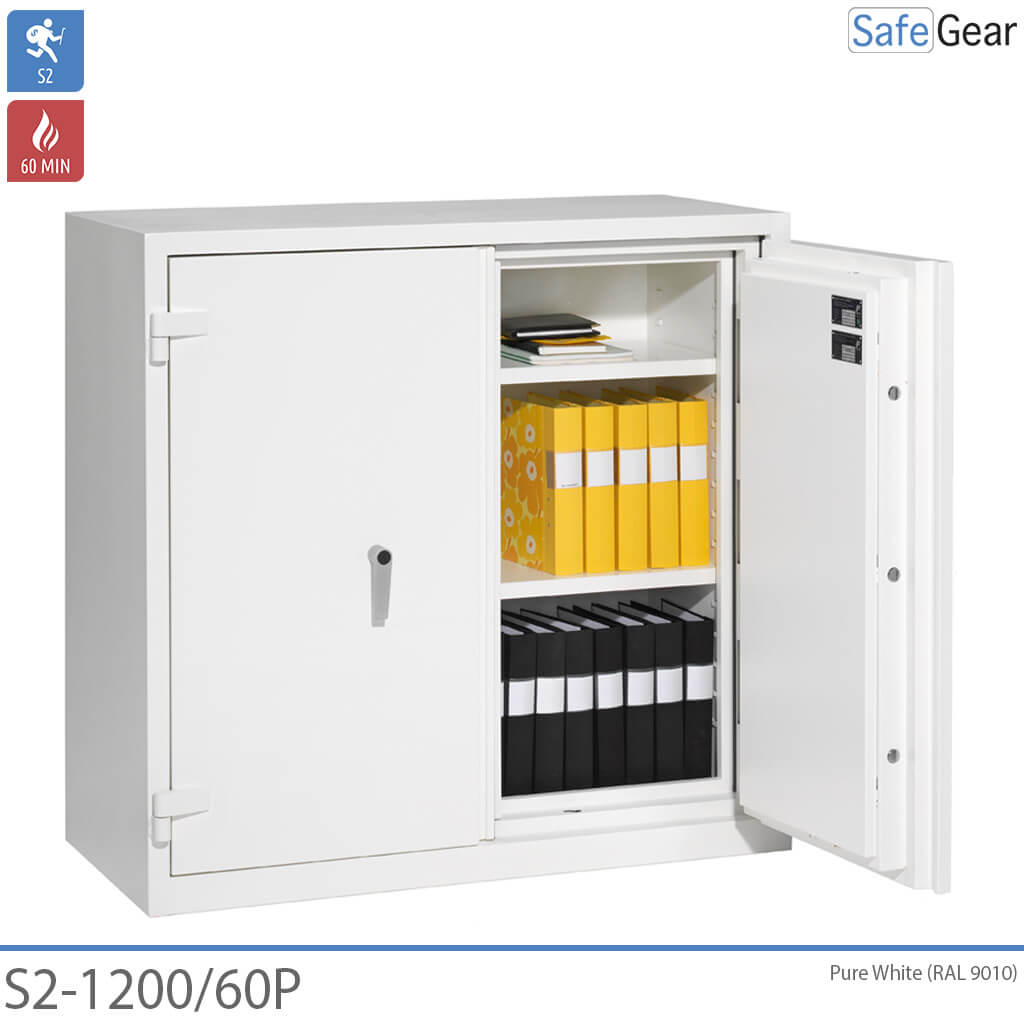 S2- Dokumentskab er et solidt dokumentskab som både har indbrudstest i Grade S2 og brandtest i 60 minutter. Skabet er konstrureret med dobbeltdøre som låses automatisk og sikres med kraftige låsebolte som er boringsbeskyttede. Record er forberedet til fastboltning i gulv. Nøglelås eller Elektroniks Kodelås