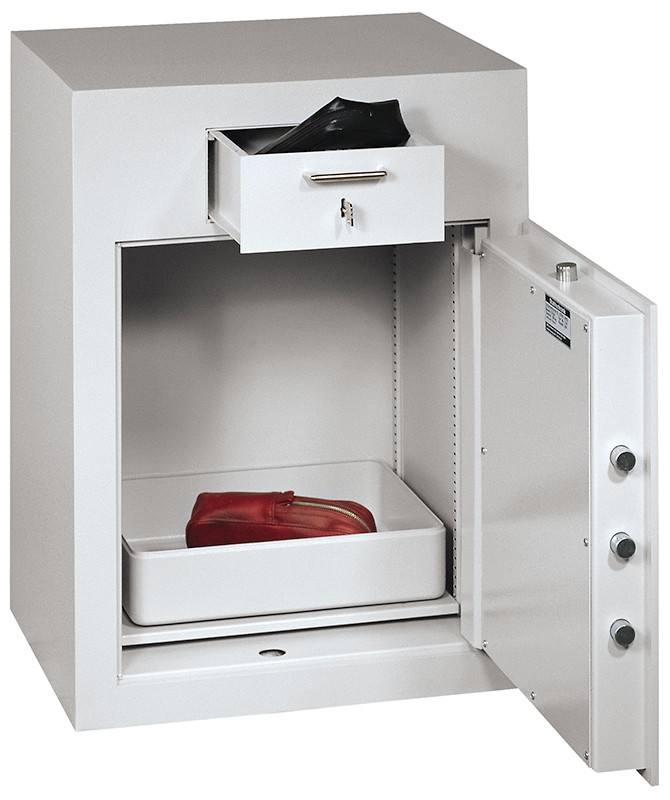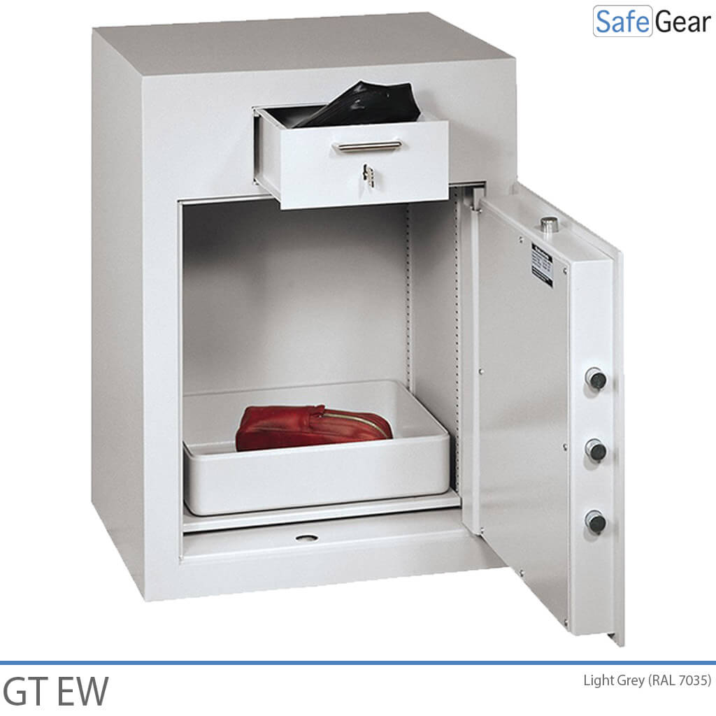 GT EW deponeringsskab er produceret i Tyskland i klasse B.Skabet er brandisoleret efter DIN 4102. Deponeringsskabet er forsynet med en aflåselig skuffe med effektiv anti-fiske anordning.