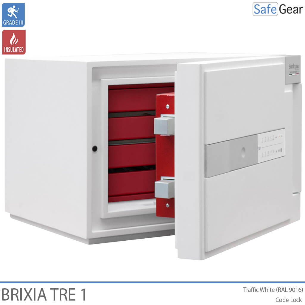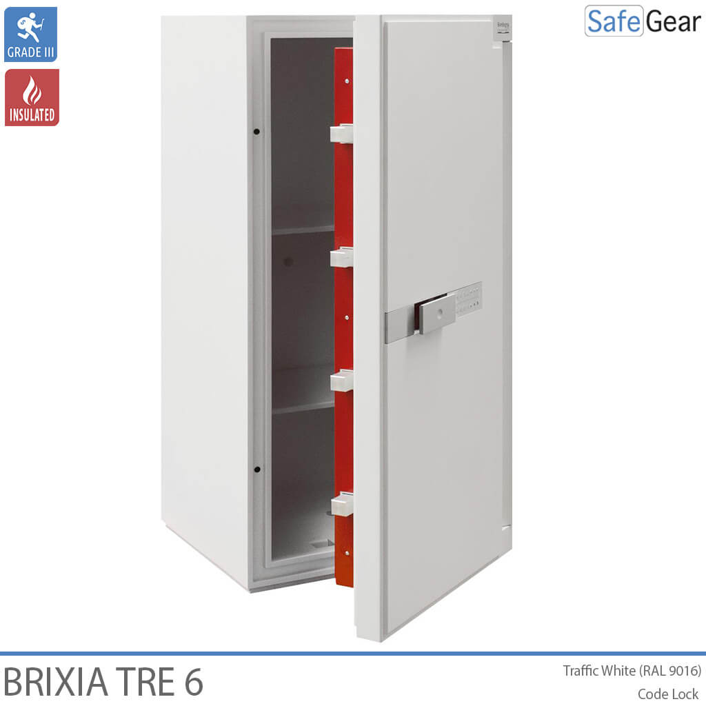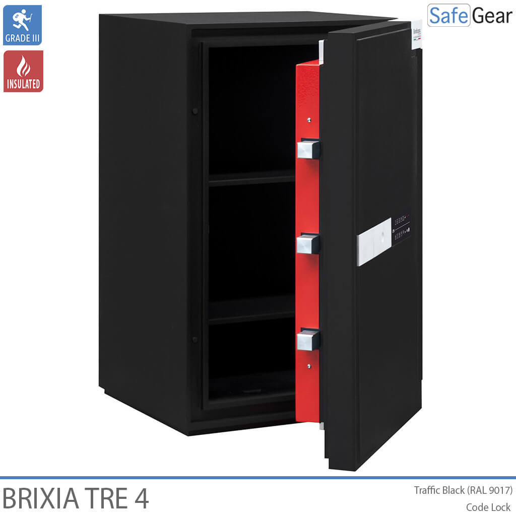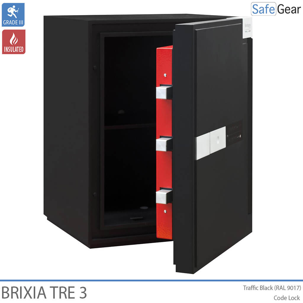 Brixa Tre er lavet med varmeafvisende materialer i vægge og dør for ekstra sikkerhed. Pengeskabet er konstrueret med en høj modstandsdygtighed mod såvel mekaniske som termiske angrebsmetoder herunder en speciel barriere til at kunne modstå hammer, mejsel, bor og andet skæreudstyr. Døren er sikret med kraftige rigler samt indgrebssikring. Værdiskabet leveres med en elegant brugervenlig kodelås der er indfældet i døren. Håndtaget reagerer på touch og forsvinder ind i døren, når det ikke anvendes. Låsen er forsikringsgodkendt i h.t. europæisk standard. Brixia Tre pengeskabe kan fastboltes til gulv og væg ved hjælp af det medfølgende monteringskit. Til Brixia Tre kan der leveres en serie indsatser til opbevaring af ringe, ure, smykker samt andre værdigenstande.