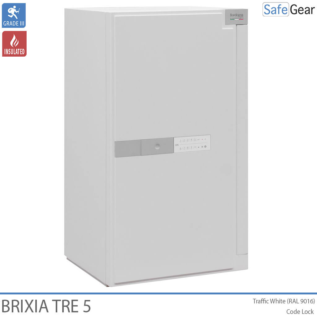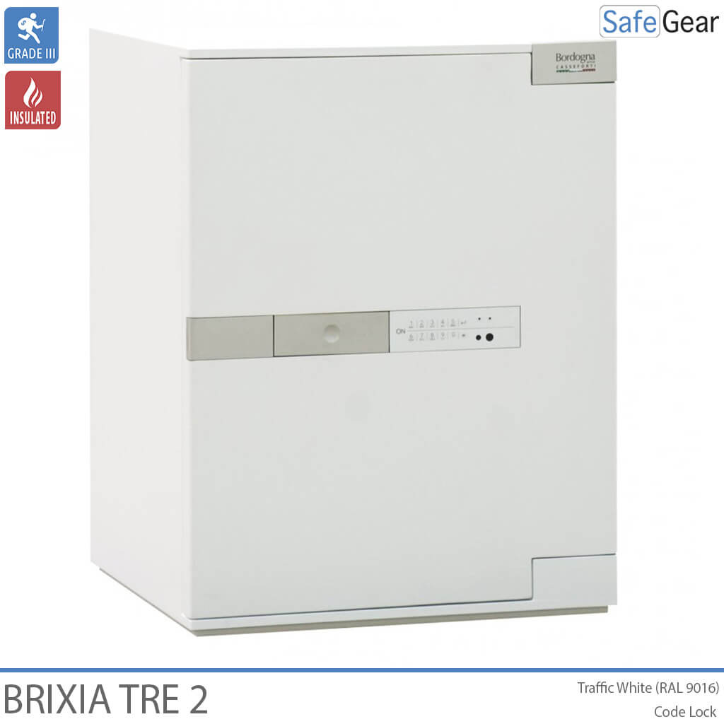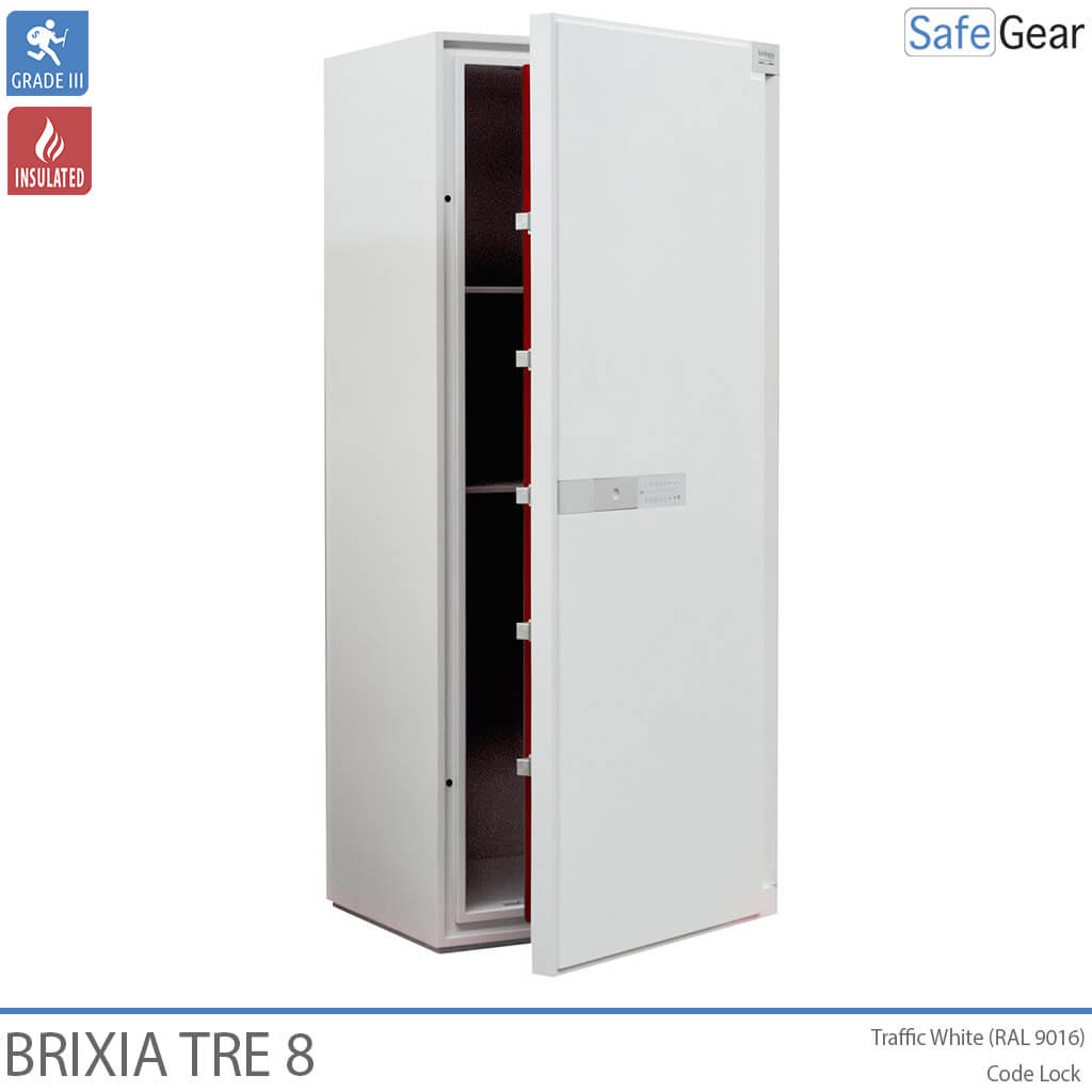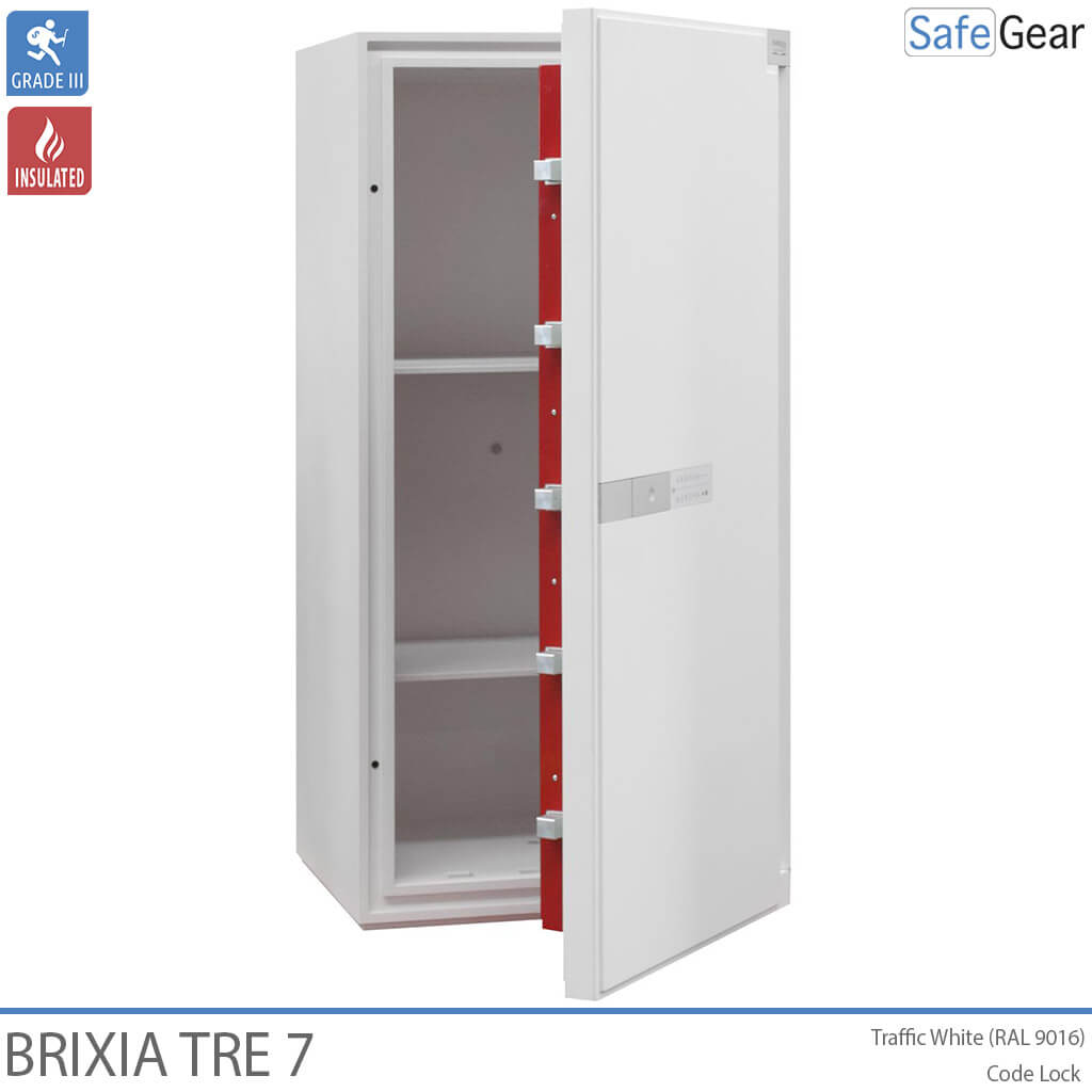 Brixa Tre er lavet med varmeafvisende materialer i vægge og dør for ekstra sikkerhed. Pengeskabet er konstrueret med en høj modstandsdygtighed mod såvel mekaniske som termiske angrebsmetoder herunder en speciel barriere til at kunne modstå hammer, mejsel, bor og andet skæreudstyr. Døren er sikret med kraftige rigler samt indgrebssikring. Værdiskabet leveres med en elegant brugervenlig kodelås der er indfældet i døren. Håndtaget reagerer på touch og forsvinder ind i døren, når det ikke anvendes. Låsen er forsikringsgodkendt i h.t. europæisk standard. Brixia Tre pengeskabe kan fastboltes til gulv og væg ved hjælp af det medfølgende monteringskit. Til Brixia Tre kan der leveres en serie indsatser til opbevaring af ringe, ure, smykker samt andre værdigenstande.