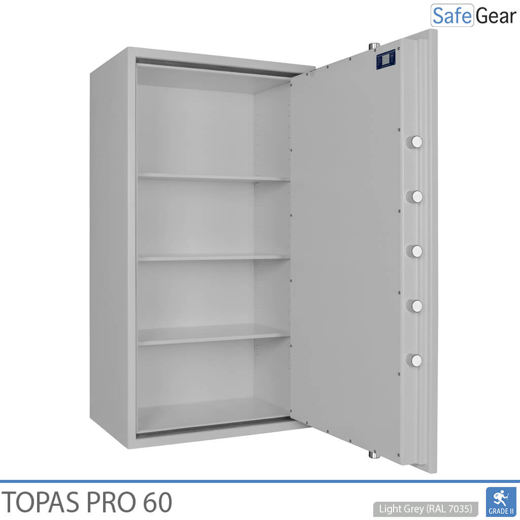 Et Topas Pro pengeskab er udført i et flot design, som vil gøre sig godt i virksomheder eller i private hjem. Skabet er indbrudstestet i Grade 2, hvilket sikrer en høj tyverisikring af dine værdier. Værdiskabet har specialfyld i væggene, der gør skabet op til 20% lettere end tilsvarende modeller.