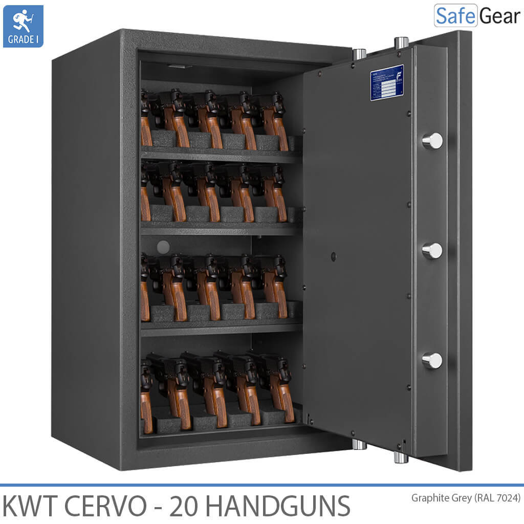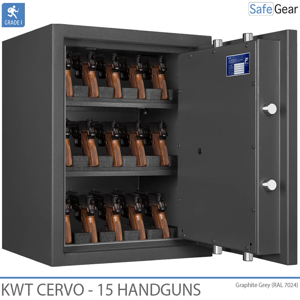 Forsikringsgodkendt våbenskab, som på grund af Grade 1 certificeringen også må indeholde større kontante beløb Skabet er beregnet til opbevaring af håndvåben, der placeres i medfølgende skumholdere, der ikke kan ridse våbnene.